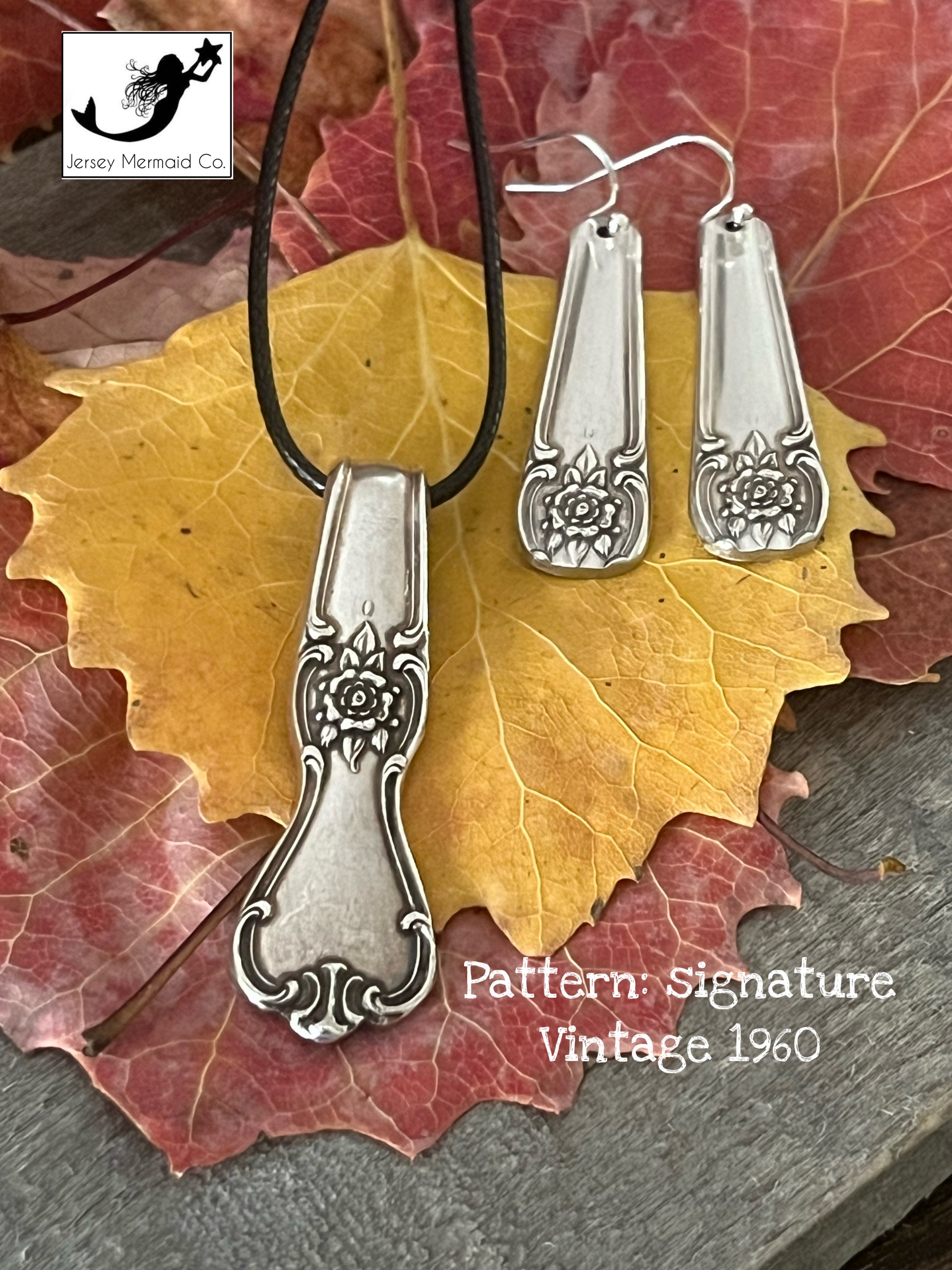 Every piece of jewelry that Jersey Mermaid Co. designs has a story to tell. This pendant was reimagined from a teaspoon. Pattern is Signature, Vintage 1960.