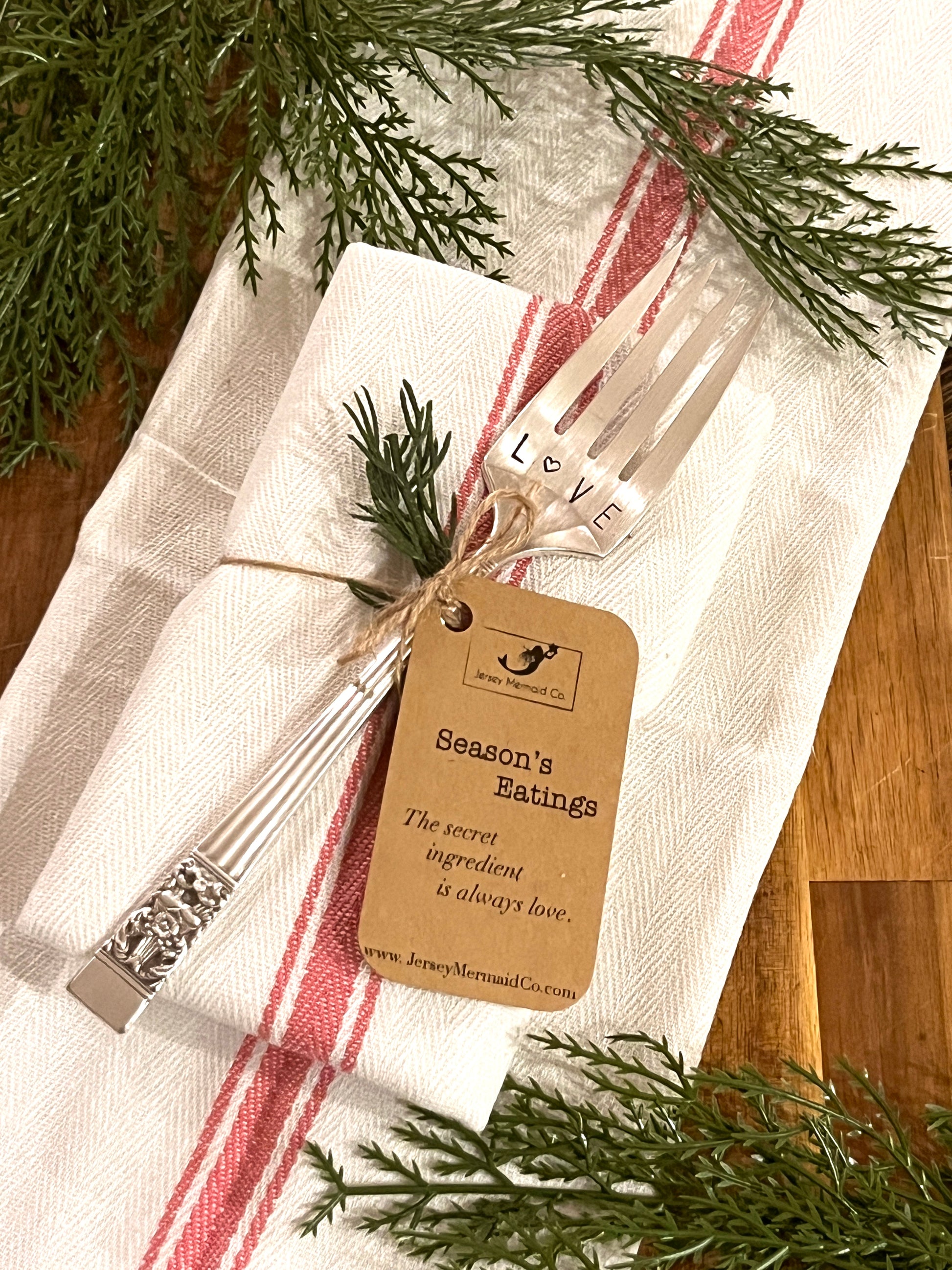 Choose your hand-stamped word, and l'll select the perfect silver plated, vintage, large serving spoon pattern for you. Each bundle is paired with a vintage-vibe tea towel, tied with jute, and accented with a sprig of faux evergreen and a sweet tag.