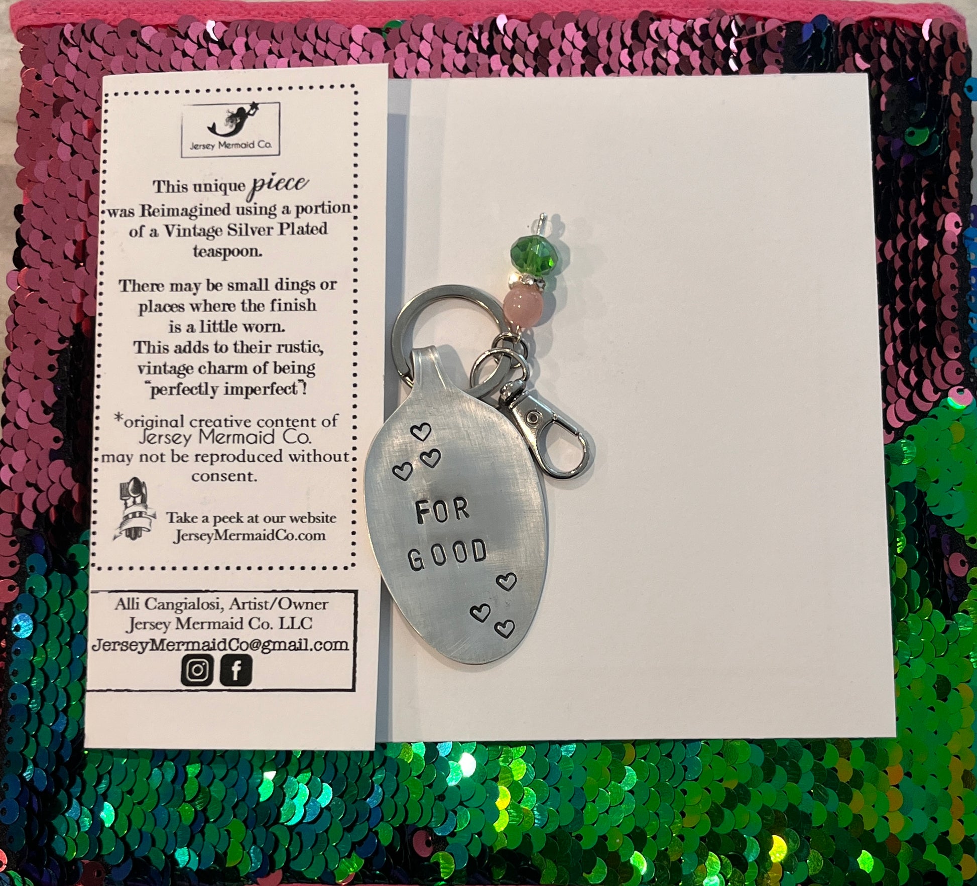 Jersey Mermaid Co. has transformed vintage silver plated spoon bowls into clip ons , each piece bringing unique character and charm to your everyday accessories. Each is accented with pink and green beads.