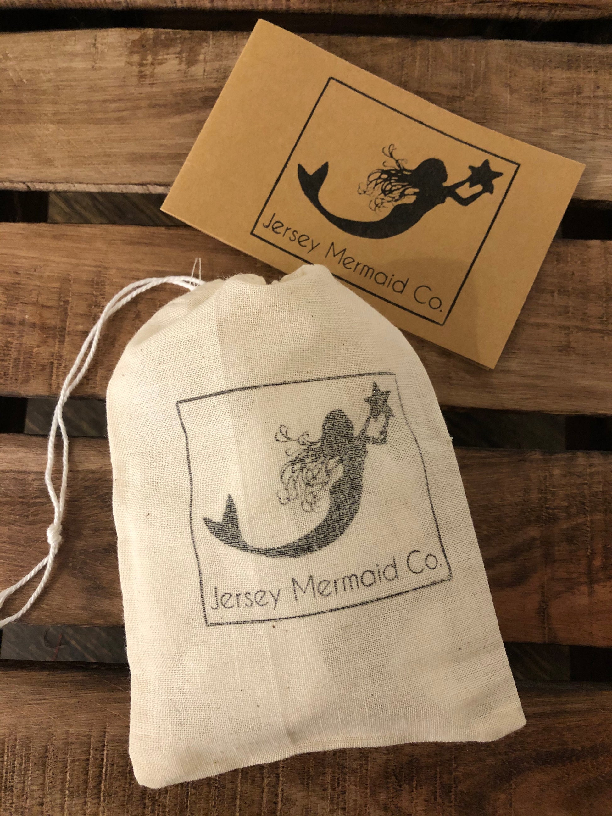 Each spoon ring is presented in a cotton bag stamped with the Jersey Mermaid Co. logo and includes a polishing cloth and product info card with pattern name and year.