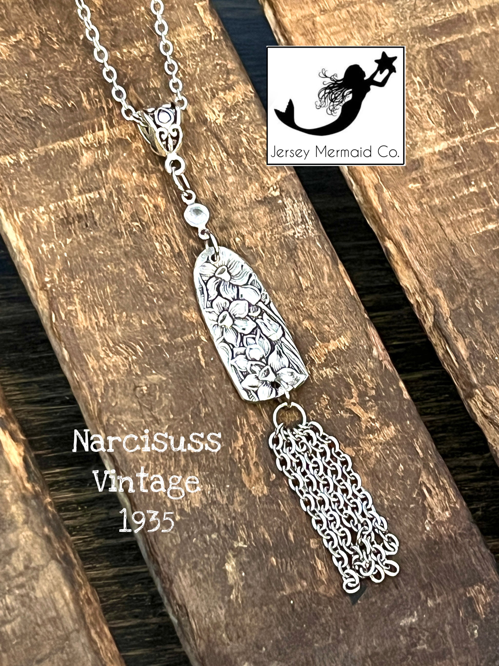 Narcisuss Pendant with small crystal and stainless chain pieces. Silver Plated-Vintage 1935.