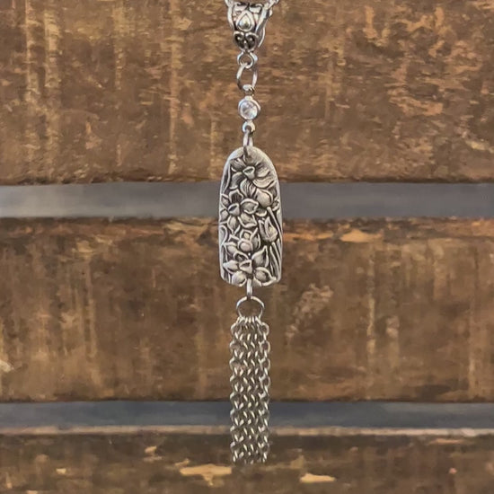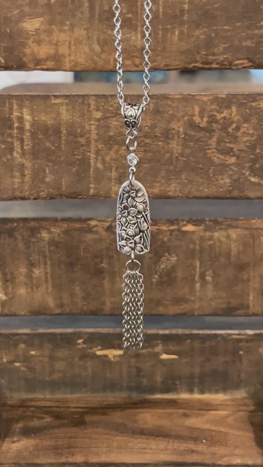 Reimagined from the highly sought-after vintage Narcissus pattern, this pendant features five delicate strands of chain that move gracefully with every step. Accented with a tiny crystal for a subtle touch of sparkle, it’s available on your choice of an 18” or 24” stainless chain. A timeless design that blends history, beauty, and modern wearability.