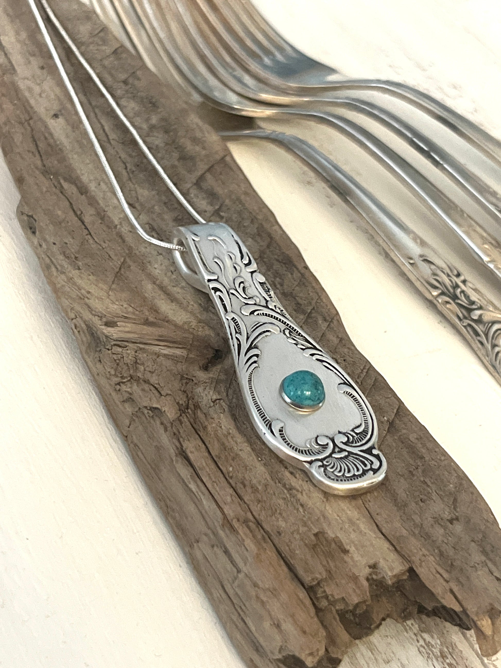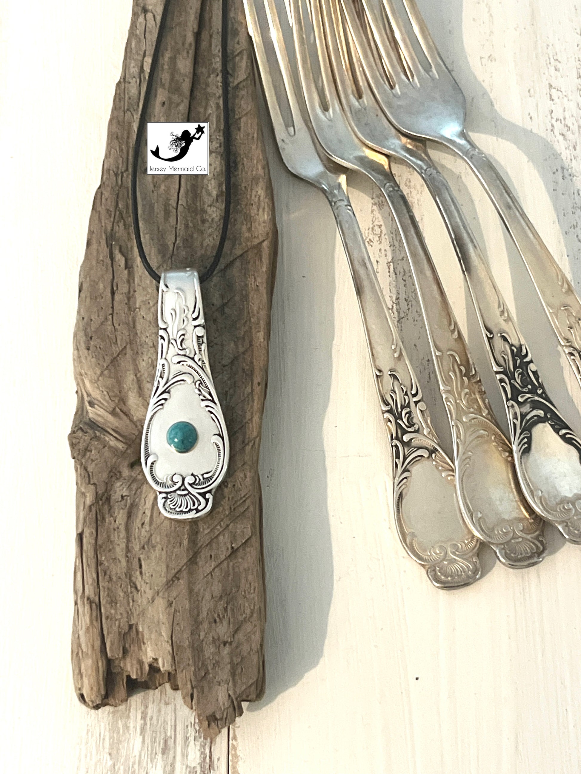 Every piece of jewelry that Jersey Mermaid Co. designs has a story to tell. This pendant has been Reimagined using a dinner fork. It is accented with a faux turquoise stone rivet.