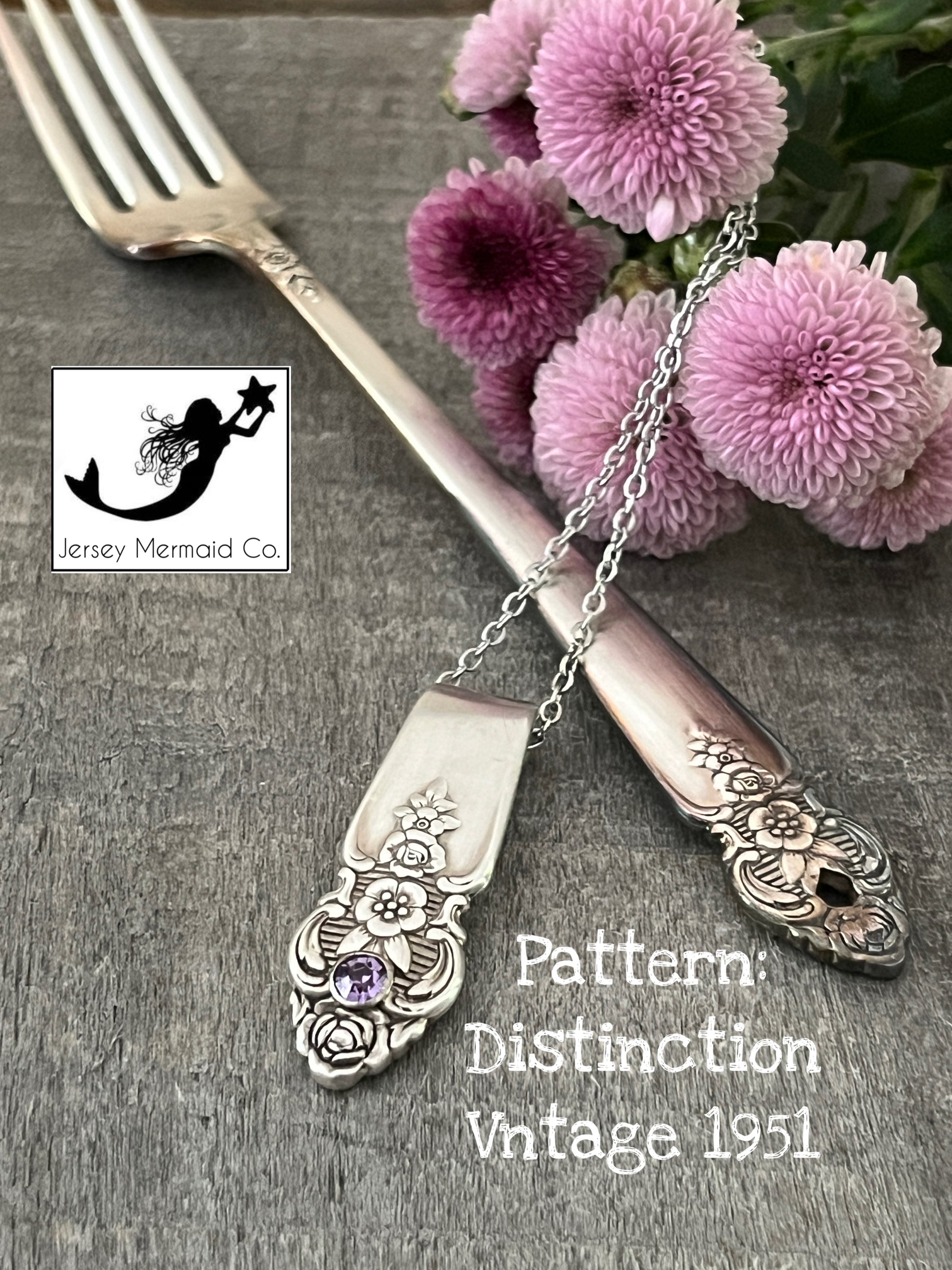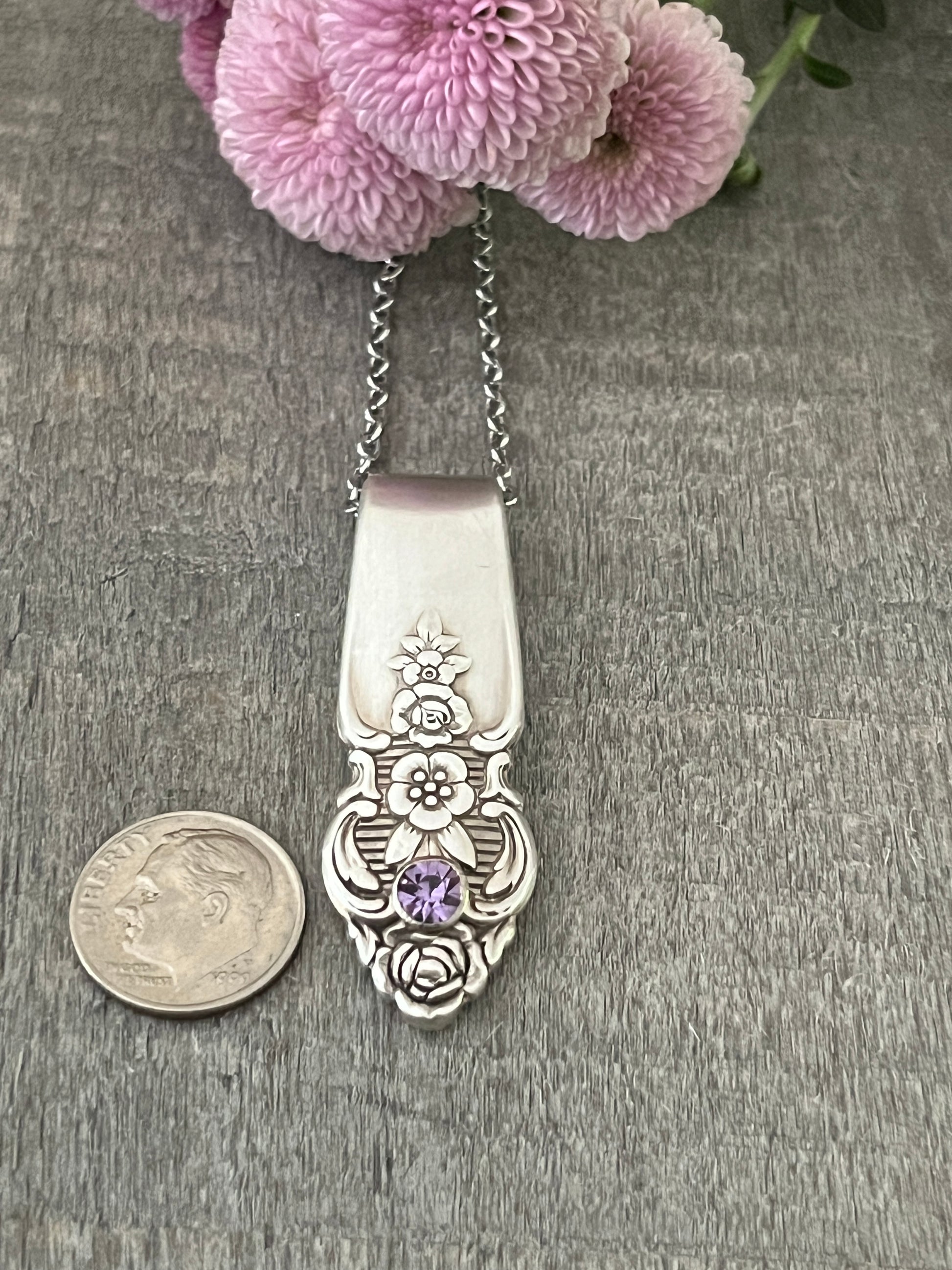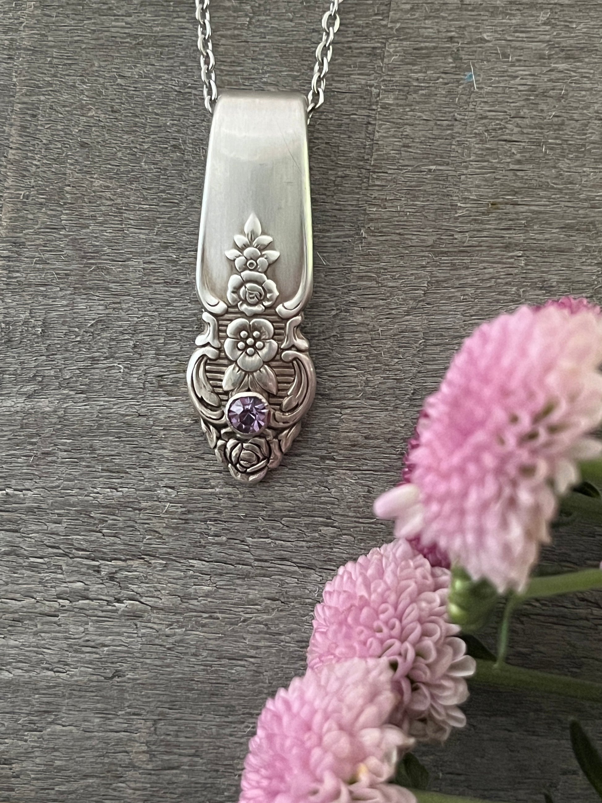 Pattern is Distinction , vintage 1951. The pendant is reimagined using a portion of a fork handle. A purple crystal rivet has been set in the pendant.