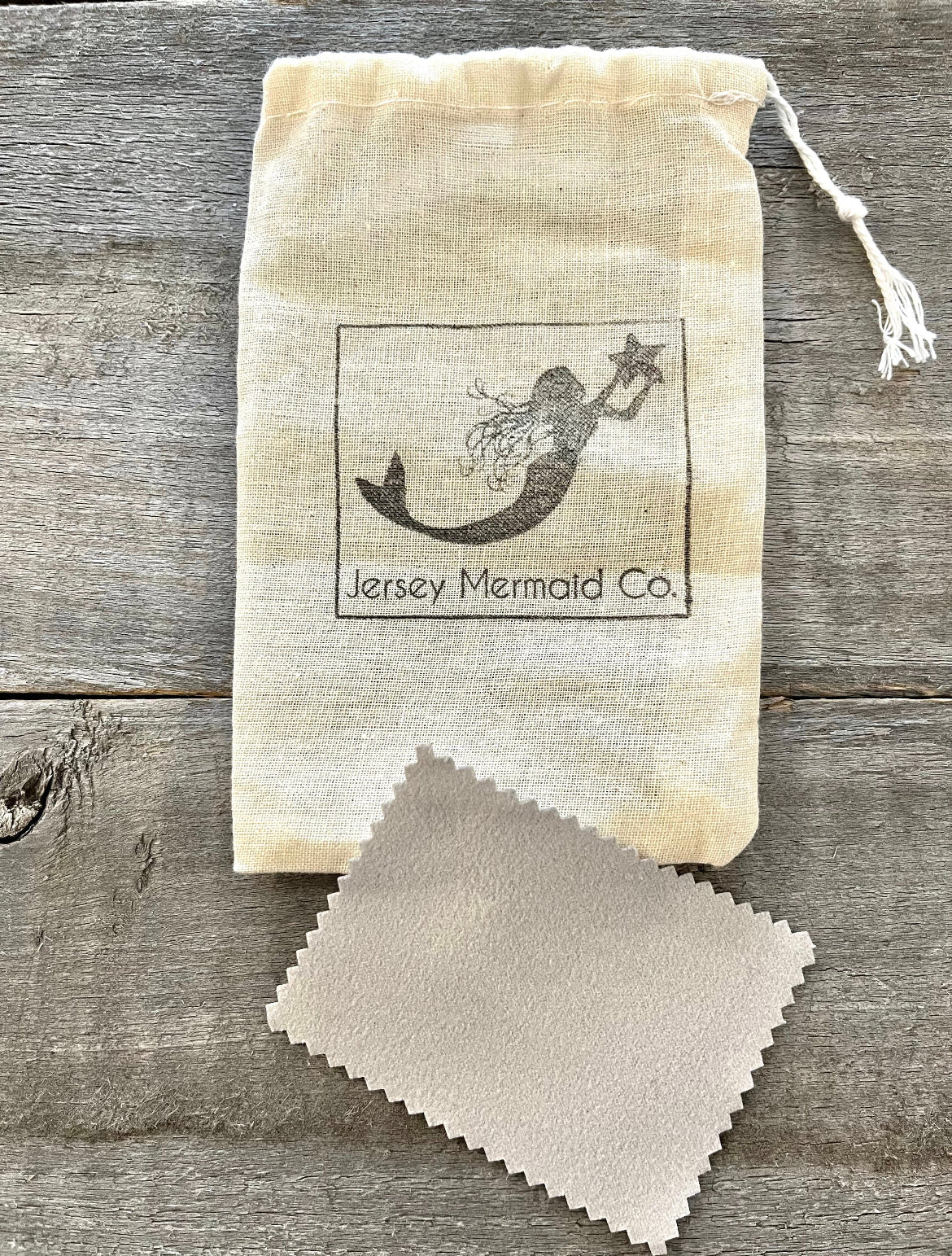 Each spoon ring is presented in a cotton bag stamped with the Jersey Mermaid Co. logo and includes a polishing cloth and product info card with pattern name and year.