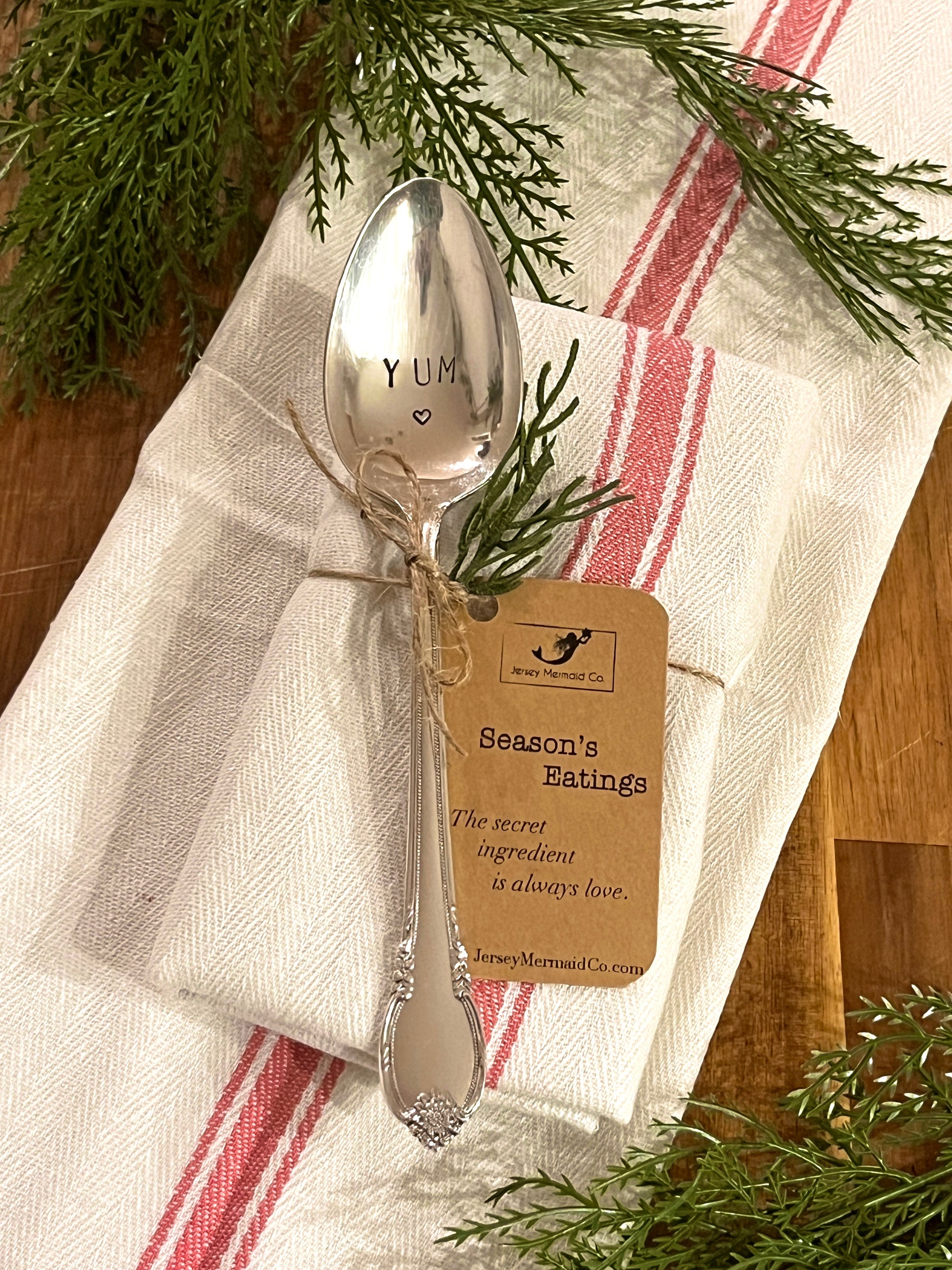Choose your hand-stamped word, and l'll select the perfect silver plated, vintage, large serving spoon pattern for you. Each bundle is paired with a vintage-vibe tea towel, tied with jute, and accented with a sprig of faux evergreen and a sweet tag.