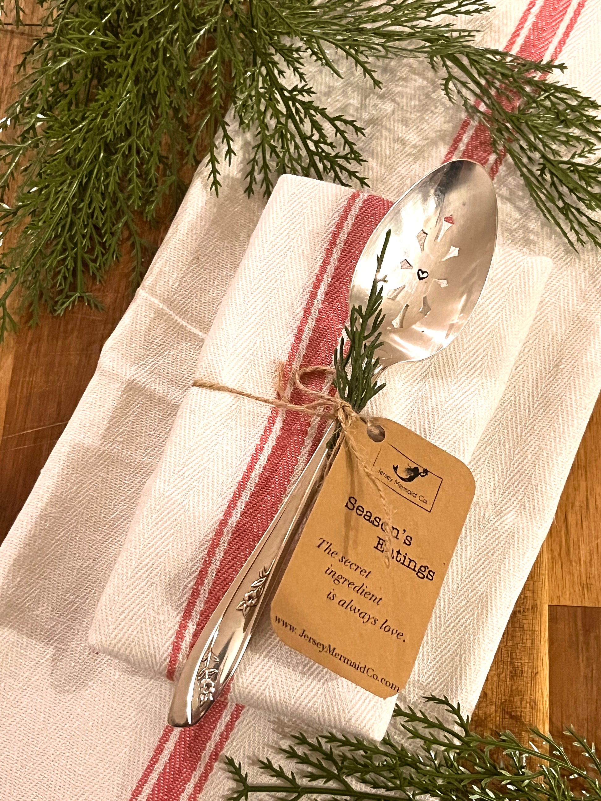 Choose your hand-stamped word, and l'll select the perfect silver plated, vintage, large serving spoon pattern for you. Each bundle is paired with a vintage-vibe tea towel, tied with jute, and accented with a sprig of faux evergreen and a sweet tag.