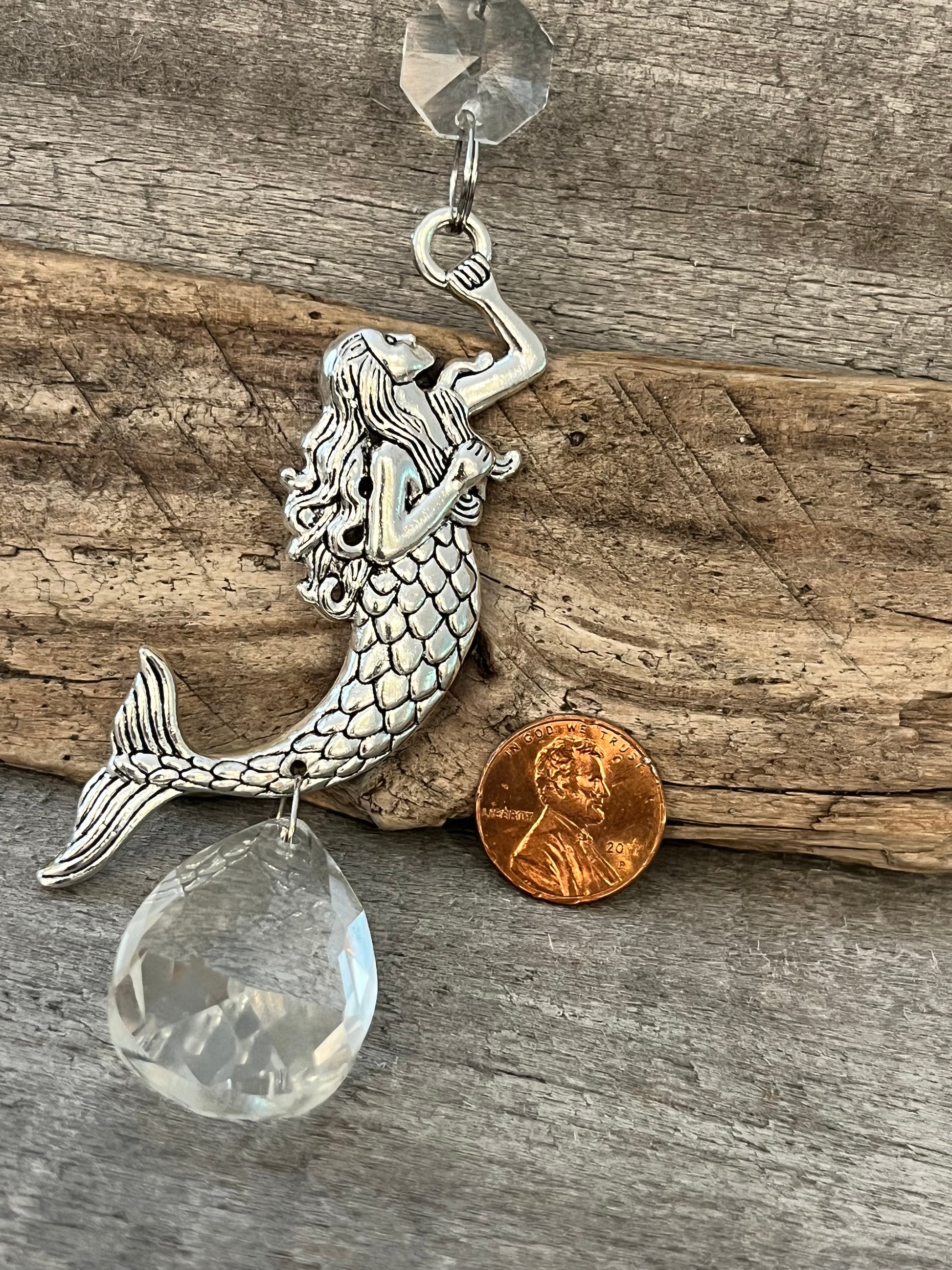 The beauty of a large Mermaid charm ( 2.5 inches) is showcased along with crystal octagons and a large crystal chandelier prism.